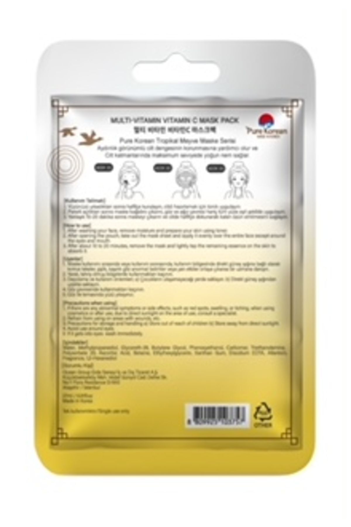 Pure Korean Multi Vitamin Maske Vitamin C.; Vita C ekstrat cilde vitamin desteği sağlar.; Aydınlık görünümlü cilt dengesinin korunmasına yardımcı olur ve cilt katmanlarında maksimum seviyede yoğun nem sağlar.; Kullanım: 1. Yüzünüzü yıkadıktan sonra hafifçe kurulayın, cildi hazırlamak için tonik uygulayın.; 2. Paketi açtıktan sonra maske kağıdını çıkarın, göz ve ağız çevresi hariç tüm yüze eşit şekilde uygulayın.; 3. Yaklaşık 10-20 dakika sonra maskeyi çıkarın ve cilde hafifçe dokunarak kalan özün emilmesini sağlayın.; Made in Korea 27 ml.