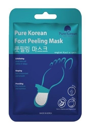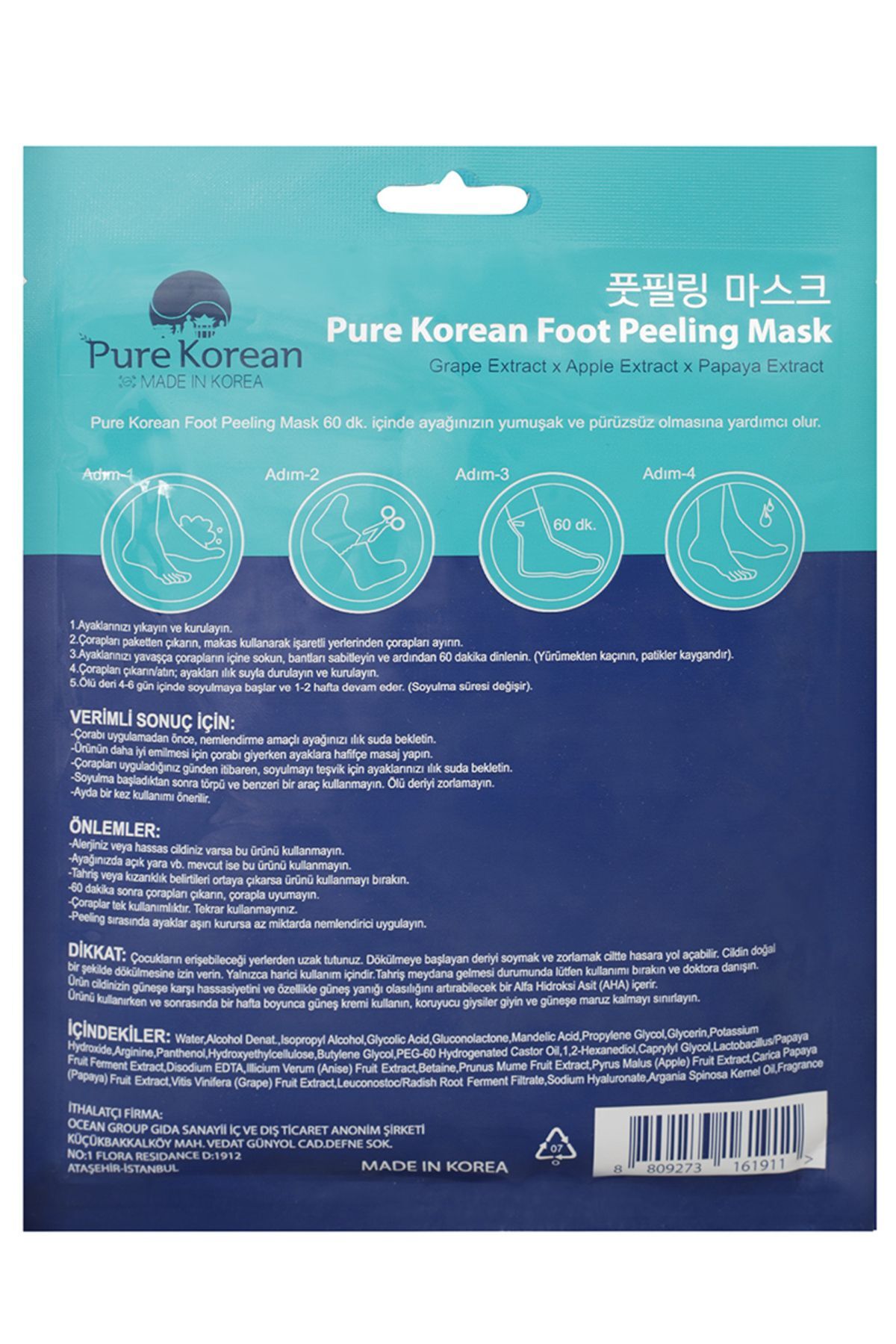 Pure Korean Foot Peeling Mask; Kuru ve çatlak bölgelerde etkili çorap tipi ayak derisini soyan maske. Ayak derisini soyar, yumuşak ve pürüzsüz olmasına yardımcı olur. Papaya, elma ve üzüm ekstraktları içerir. Kullanımı: Daha etkili sonuç için kullanım öncesi ayağınızı ılık suda bekletin. Çorapları ayağınıza giyin, ürün üzerindeki bantları kullanarak çorapları sabitleyin. Oturur pozisyonda 60 dk.bekleyin. Çorapları çıkarın ayaklarınızı ılık su ile durulayın. 3-7 gün arasında ayaklarınız soyulmaya başlayacaktır.